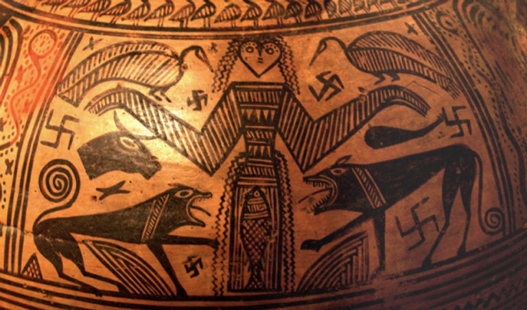 But I figured it out. The swastikas are for the rotating sky, the two lions allways linked to the sky like they flank the sundisk in the aker symbol and in sumerian depictions of demon godess with her owl feet.