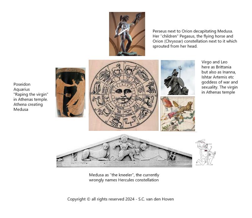“Medusa is the virgin Artemis (eastern fish) who gets raped by poseidon (aquarius) then turns into medusa at the kneeler constellation and later gets beheaded by Perseus at orion where from her head sprouts Orion and Pegasus, her children.” – Stijn van den Hoven 2025