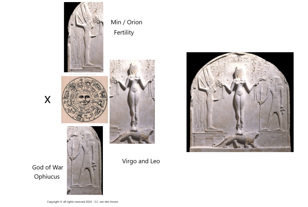 I have been looking for X. Hence it has been blank in the images. But found her later as Anunitum as the godess of war and queen of heaven. The two cosmic pairs the war/dead and fertility/life. The central image of the ketesh stele is the virgin Virgo at Leo AND the godess of war at pisces eastern fish godess of heaven. Its like the tryptich image / doors where the central door is both the spring and autum equinox. two aspect of the same coin. Its inanna/Ishtar, with her sister Ereshkigal at the Kneeler constellation.
