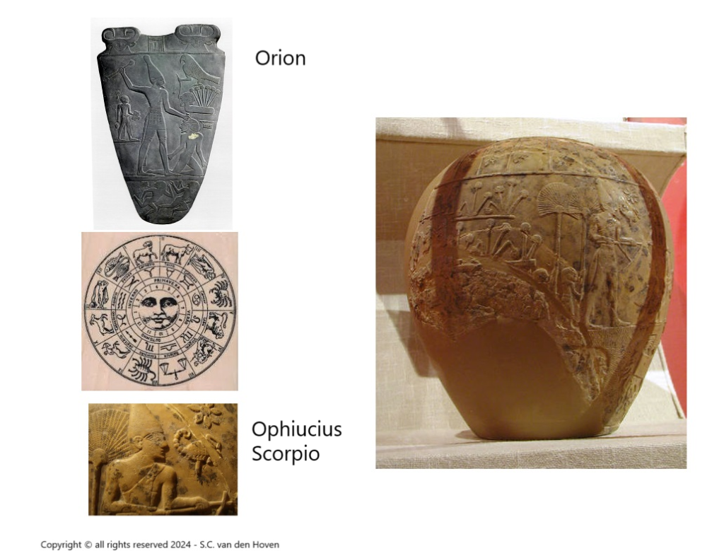 Narmer and King Scorpio could be a precursor version of Osiris vs Seth, Min vs God of War or, Orion vs apollo, God vs the devil and even Cain vs Able. Agriculture vs Pastoralism based on the season. Or fertility vs war. A first marker on the two opposite figures in the sky marking the seasons. The godess on the half way mark had both aspects, being sexual/fertility and war attributes, a mix of both.