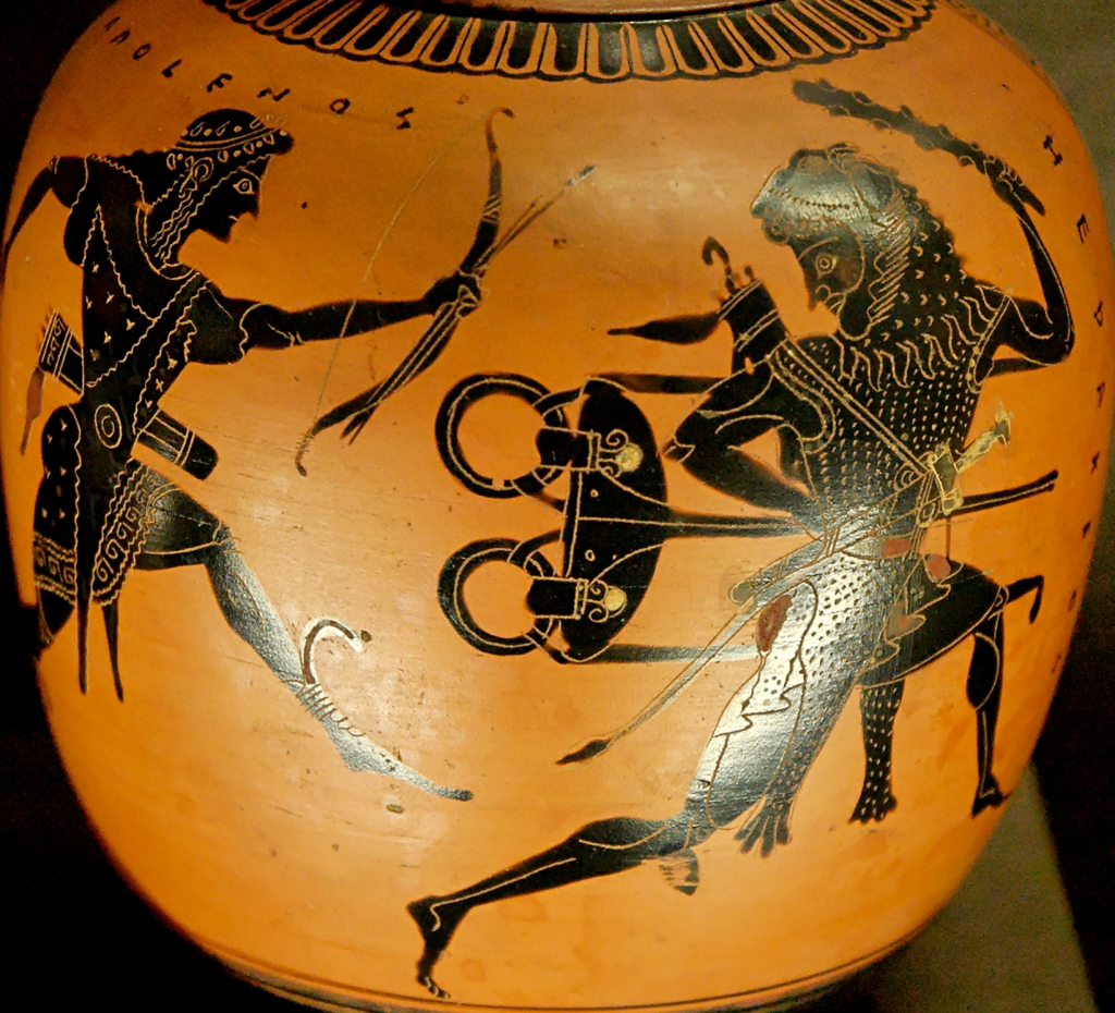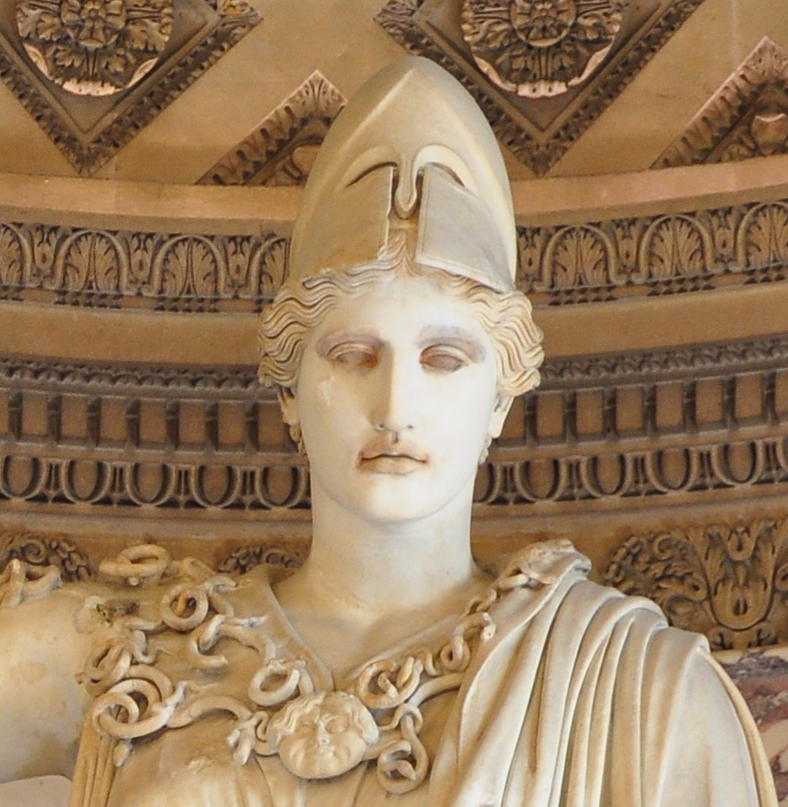Athena wearing the Medusa Gorgon head (statue of Athena of velletri, Louvre, source: https://en.wikipedia.org/wiki/Athena_of_Velletri) and a mosaic, first century BC depiction of Alexander wearing the aegis on the Alexander Mosaic, Pompeii (Naples National Archaeological Museum) Source: https://en.wikipedia.org/wiki/Aegis#/media/File:Alexander_and_Bucephalus_-Battle_of_Issus_mosaic–Museo_Archeologico_Nazionale-_Naples_BW.jpg