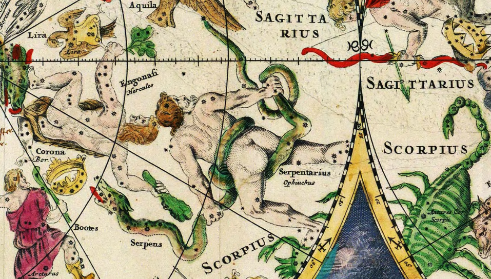 The region opposite of orion, “the underworld”, is were these characters are found. . Hercules, Ophiucius and Scorpio. If one looks closely one will find objects linked to Apollo, such as his Lyre, bow and arrows, the scorpion he send to kill Orion and other attributes close relevant to see he is there even though not named in our current zodiac. Ophiucius is “the son of Apollo” but this happened a lot, where the figure was replaced by a “son”. The current zodiac is like a puzzle, with remnants and clues left behind.