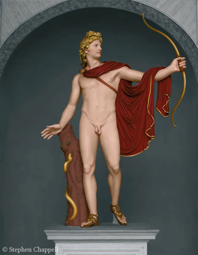 The Apollo belvedere statue, missing its bow but has the pose holding it. (or a spear like the god of war on the Ketesh Stele) Note the snake on the tree trunk. Yes, Apollo is our later “devil”, the god of the underworld. A god of War.