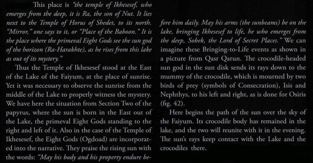 I then found a text from the book of the Fayum that speaks about the temple of ikhesesef (Sobek), that it was east of the lake (identified as Qasr El Qarun) and how “an island was used in the lake” to watch the sun rise east, from the lake, which was “north and to the side of it”, which matches the site of Soknopaiou Nesos including the lake island remark.